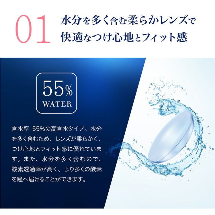 • 水分を多く含む柔らかレンズで快適なつけ心地とフィット感