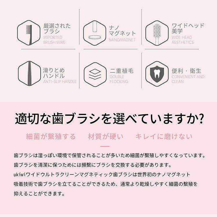 ukiwiの歯ブラシは世界初のナノマグネット吸着技術で歯ブラシを立てることができるため、通常より乾燥しやすく、細菌の殖を抑えることができます!