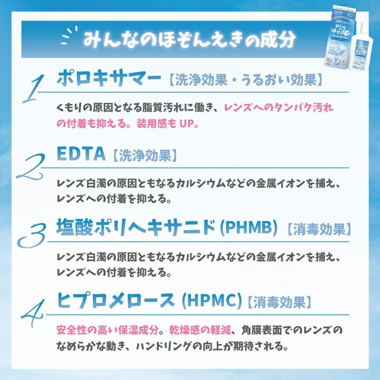 くもりの原因となる脂質汚れに働き、レンズへのタンパク汚れの付着も抑える。装用感もUP!